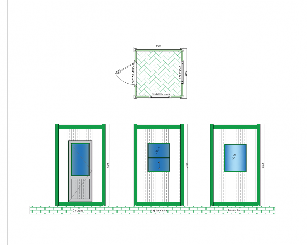 Bu panel kabin, kompakt yapısı ve işlevselliği ile dikkat çeken bir modeldir. 1500 mm x 1500 mm taban ölçüleri ve 2540 mm yüksekliği ile sınırlı alanlarda kullanım için idealdir. Şantiye alanları, güvenlik noktaları veya küçük ofis alanları gibi yerlerde geçici bir çözüm sunmak üzere tasarlanmıştır.