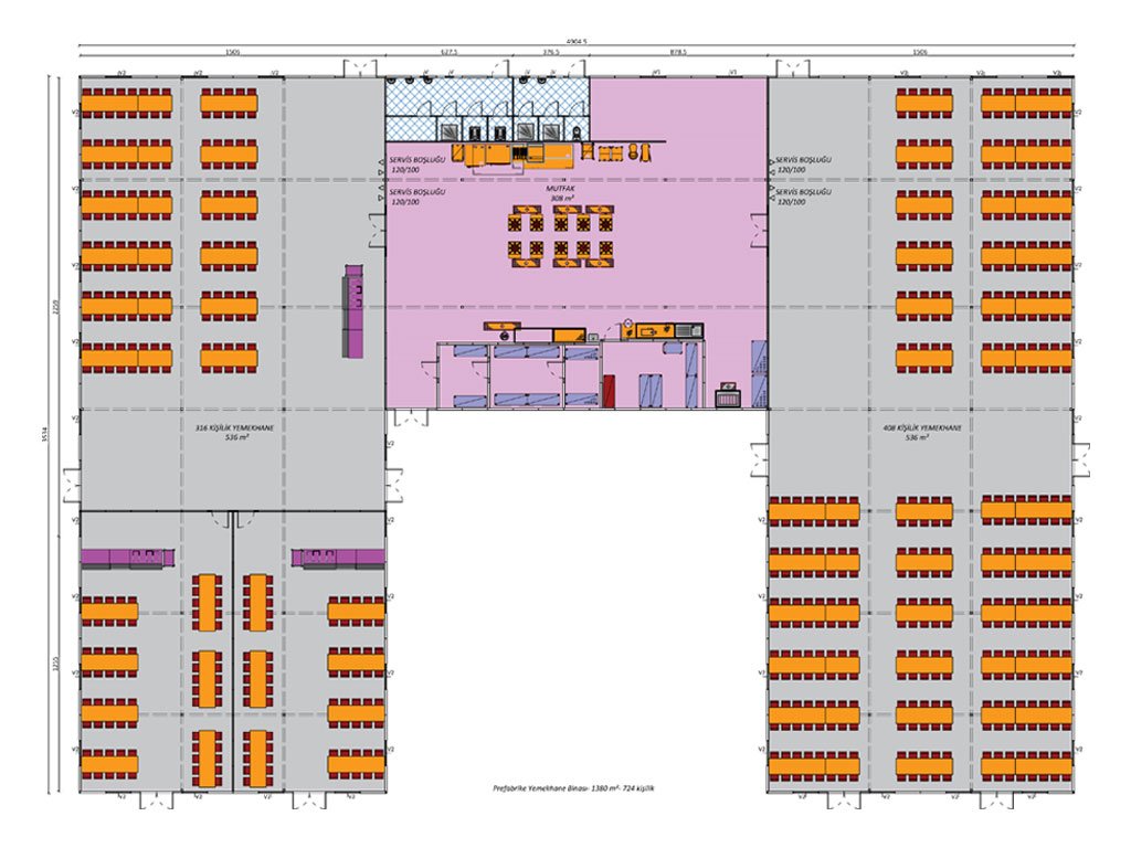 Bu görsel, büyük ölçekli projeler için tasarlanmış 1380 m²’lik prefabrik yemekhane binasının detaylarını göstermektedir. 724 kişilik kapasitesi ile geniş yemek alanı sağlayan bu bina, iki ana yemek salonu ve bir mutfak bölümü ile işlevselliği ön planda tutar. Sol ve sağ bölümlerde 408 ve 316 kişilik oturma kapasitesine sahip yemek salonları bulunurken, orta kısımda servis alanları ve 120 m² büyüklüğünde bir mutfak yer almaktadır.