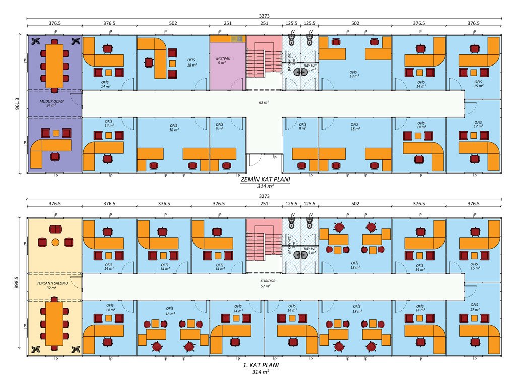 Zemin katta müdür odası, ofis alanları, mutfak ve tuvaletler bulunurken; birinci katta toplantı salonu ve daha fazla ofis alanı yer almaktadır. Zemin katın merkezinde geniş bir koridor, her iki tarafa kolay erişim sağlamakta olup, bu alan hem çalışanlar hem de ziyaretçiler için rahat bir geçiş imkânı sunmaktadır. Müdür odası 34 m² olup, yöneticilere özel bir alan sunar. Çeşitli büyüklüklerdeki ofisler, çalışma ihtiyaçlarını karşılayacak şekilde tasarlanmıştır.